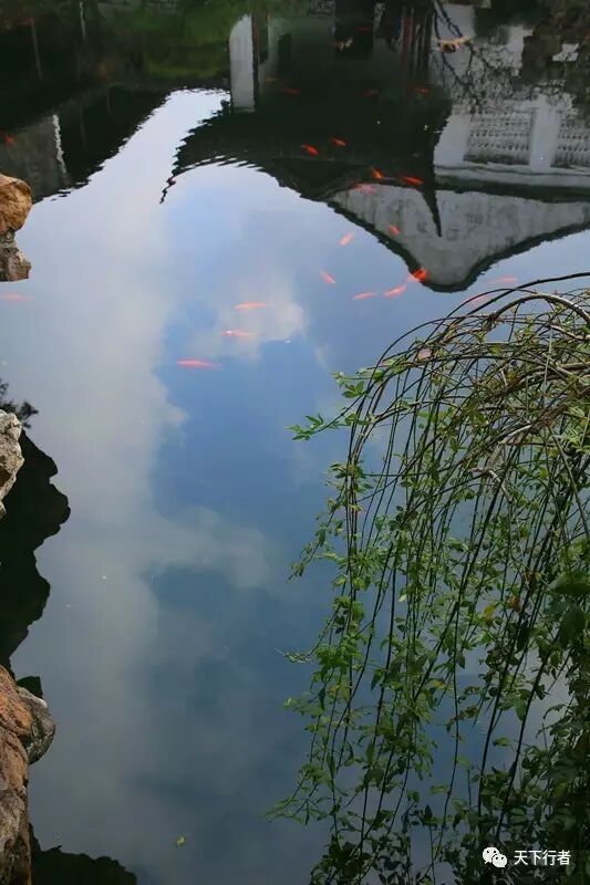 网师园池中鲜有植物花卉,清透如镜,这些高低错层的建筑群与天光山色在水中倒影成画