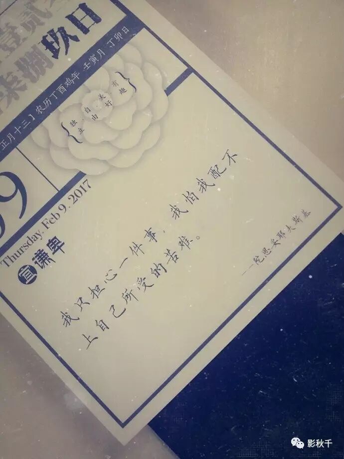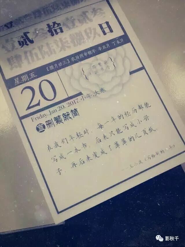 大雪的那天傍晚我还在公司,鸟姐问我回家没,我说还没有,她问我空不空有个东西送给我,我过去找她的时候递给我这本新年日历,我打开发现每一天每一页打开都有一句很美很美的话,我翻完整个2017发现时光从指间溜过很快很快,我知道又是一年要来了。