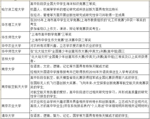 以下是根据2016年参加自主招生的高校发布的自招章程整理的各高校对单科科技优秀类的说明: