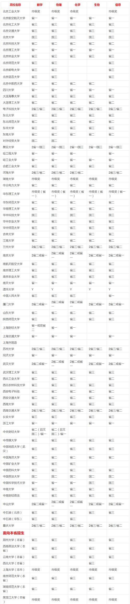 以下是根据2016年参加自主招生的高校发布的自招章程整理的各高校对五项学科竞赛的说明: