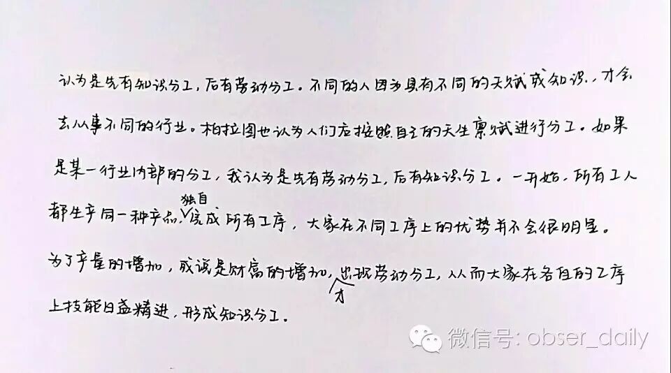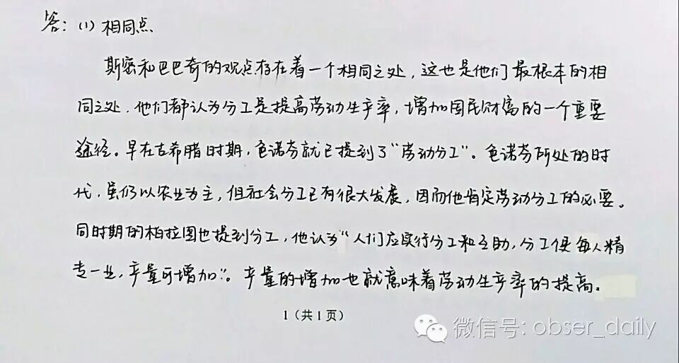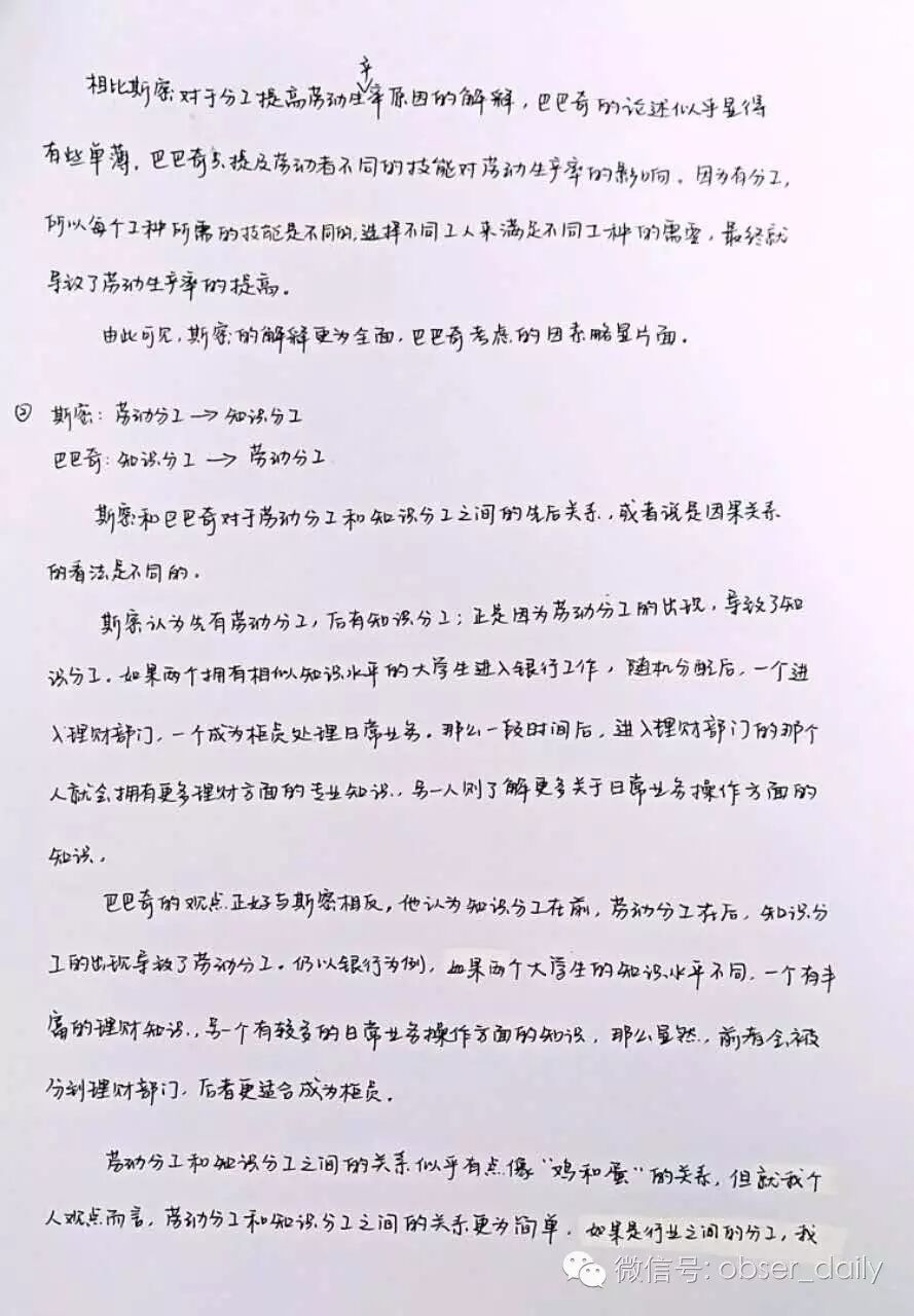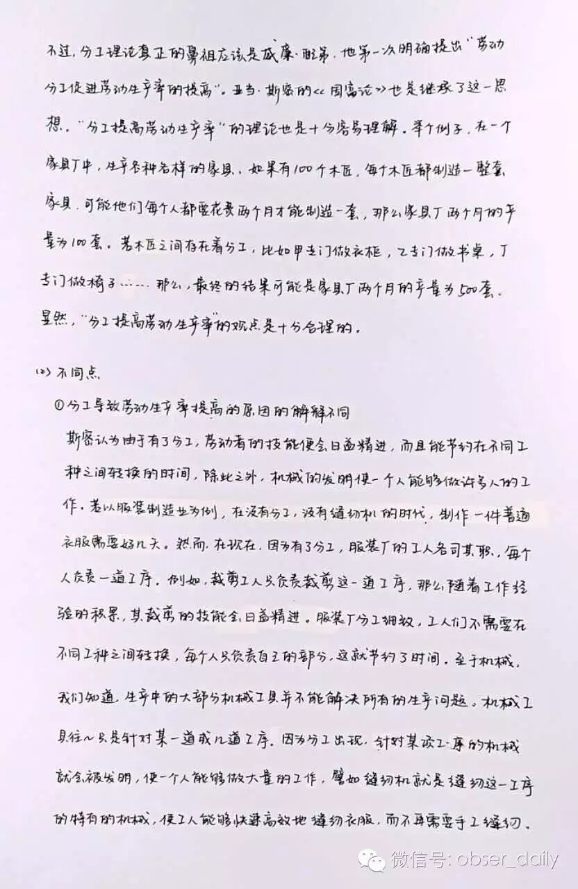 苏州大学经济系本科生竺丽鑫关于斯密与巴巴奇的分工观的分析。(登选理由:字写得好看,有抓住关键)