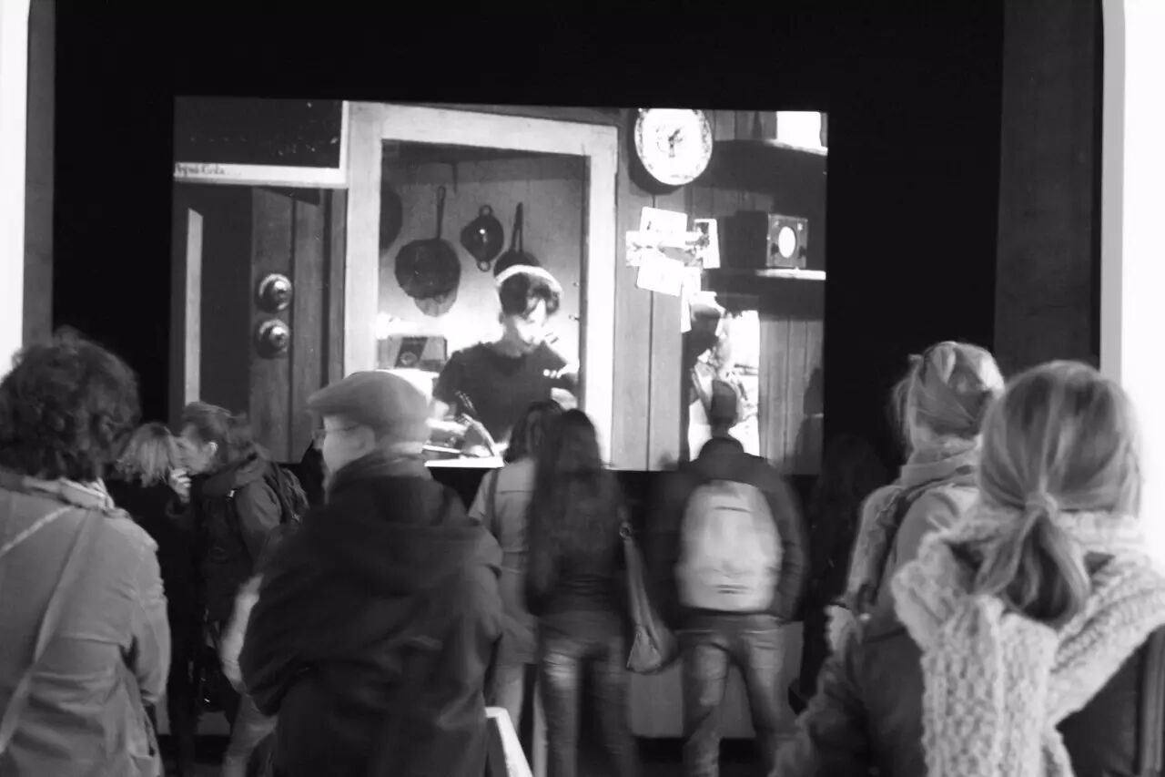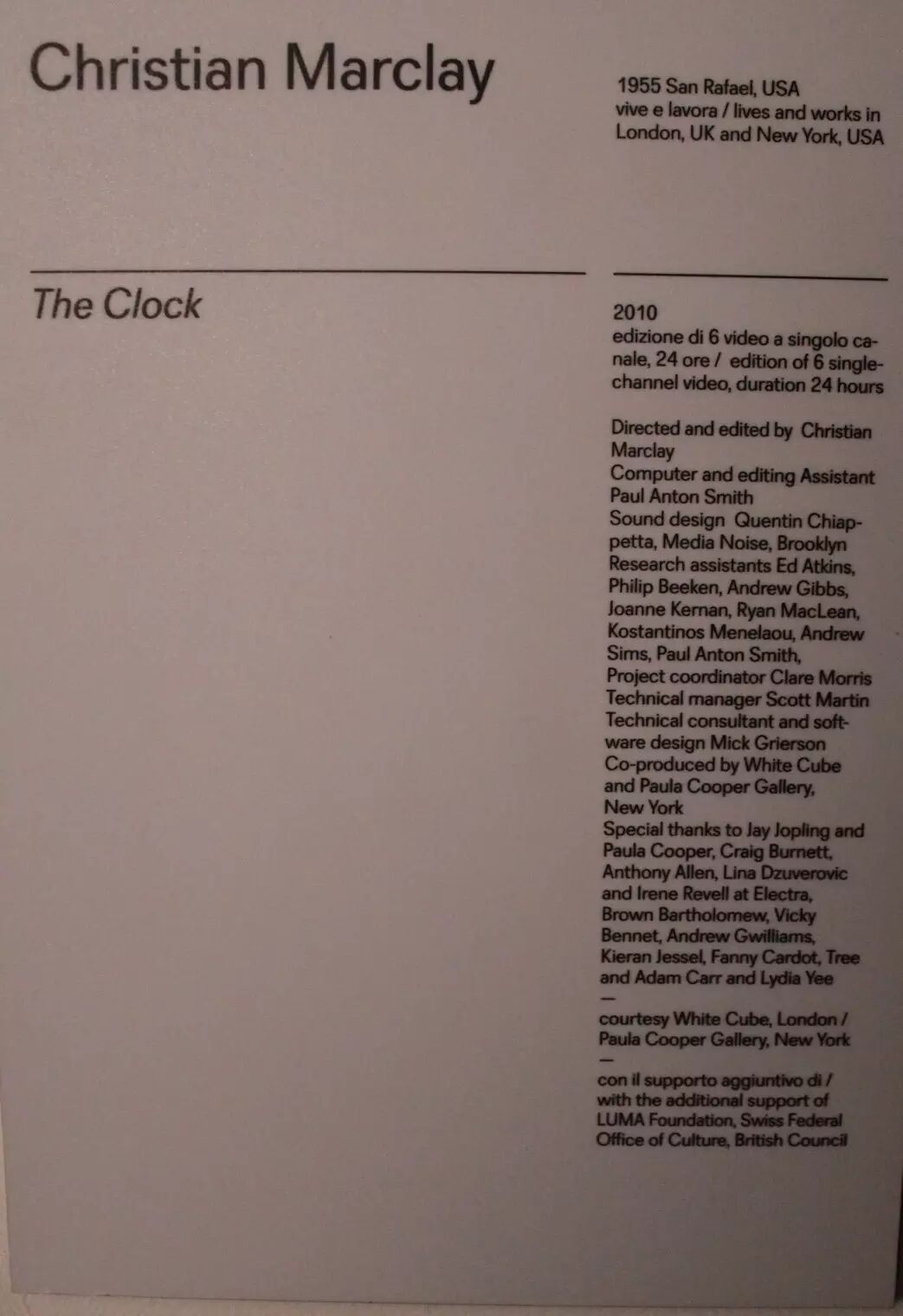 这个作品在威尼斯双年展中被设置在兵工厂受邀艺术家展区的尽头,在投影大屏幕上循环播放,展览区域设置座位以便观众观影。人们在观看作品的过程中时刻意识到真实时间的流逝,不时抬手比对电影中的时刻与真实时刻是否吻合,继续观看其他展区的紧迫感与继续观看作品的矛盾心理产生了一种轻微的焦虑。每隔一小段时间都不断有观众入席坐定或起身离席。