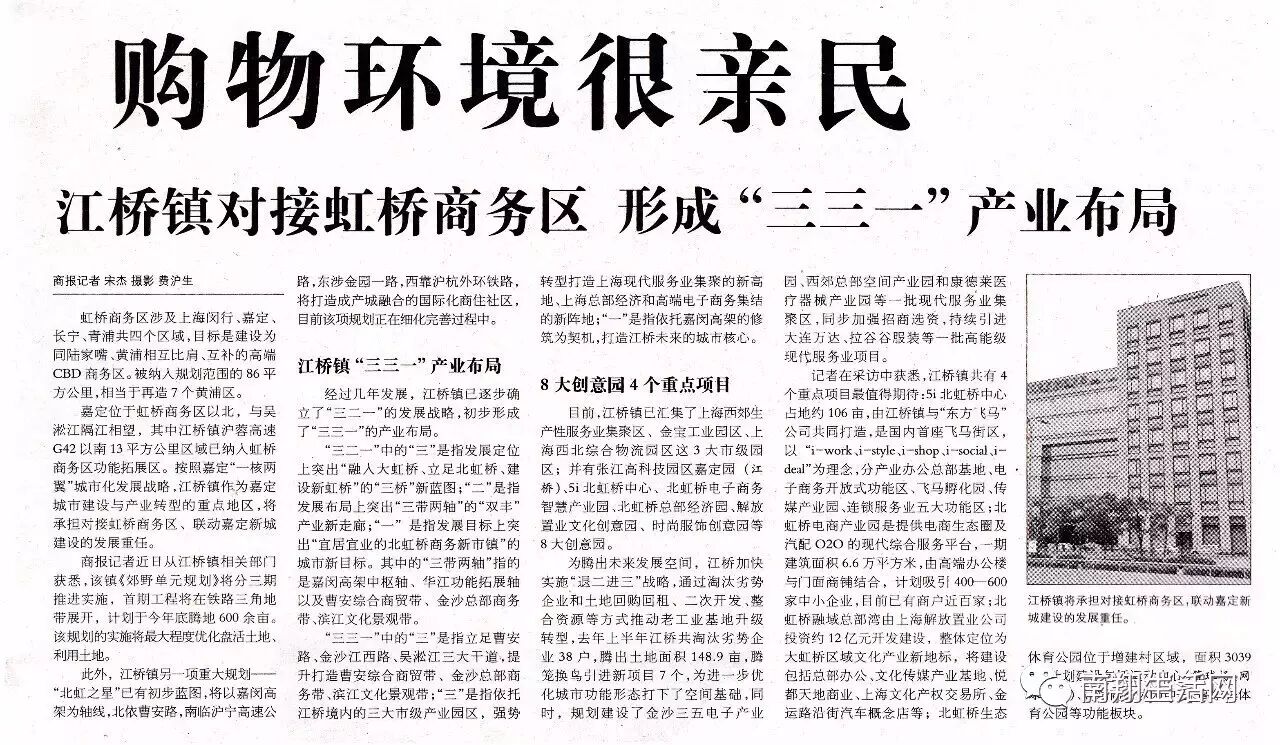 展望未来,大虹桥规划给嘉定江桥镇带来了新的契机。未来几年,嘉定江桥镇将立足北虹之地,呈现更加强劲的爆发力,全镇将紧紧围绕‘融入大虹桥、立足北虹桥、建设新江桥镇’这一宏伟蓝图,着力构筑‘三带一轴’的产业布局和空间结构,以培育‘丰’字产业丰茂之树,缔结江桥镇经济转型发展丰硕之果。