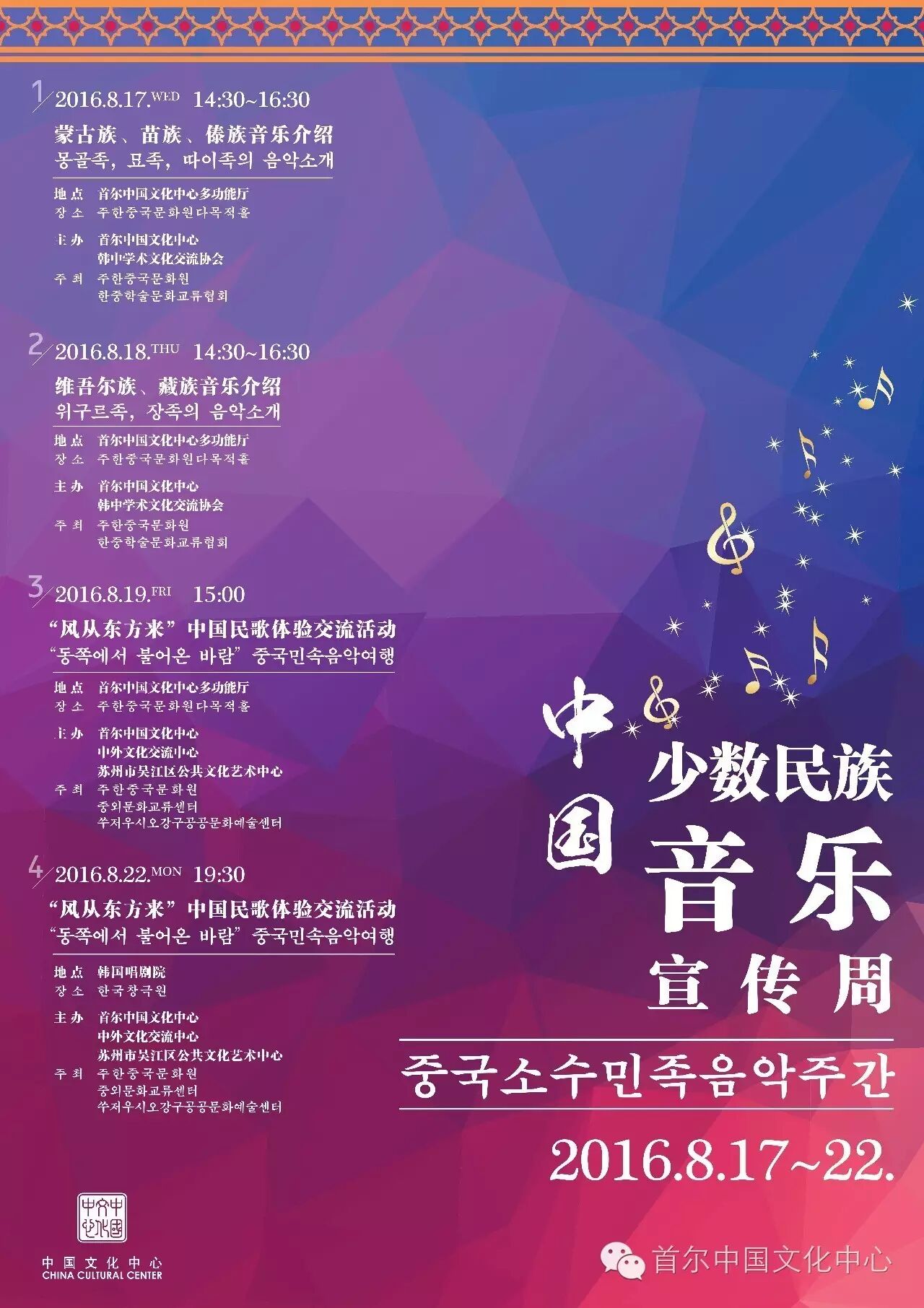 8月17日-22日,首尔中国文化中心将举办“中国少数民族音乐宣传周”活动,欢迎广大音乐爱好者关注并积极参与活动!