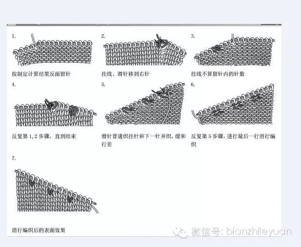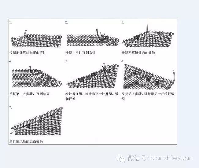 第6行,如图上第5步,在正面消行,滑针正常织,挂线和下一针并针织(挂线放下边),正面织完斜肩结束。
