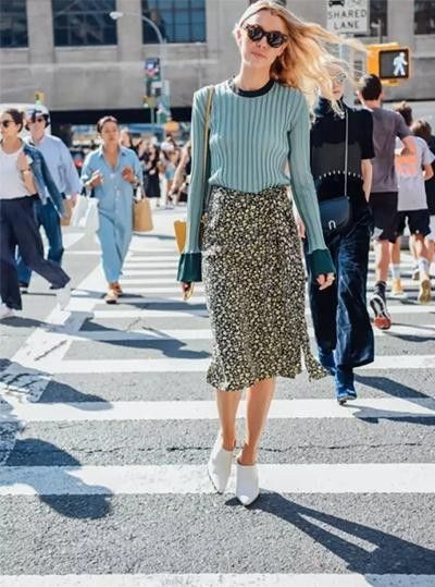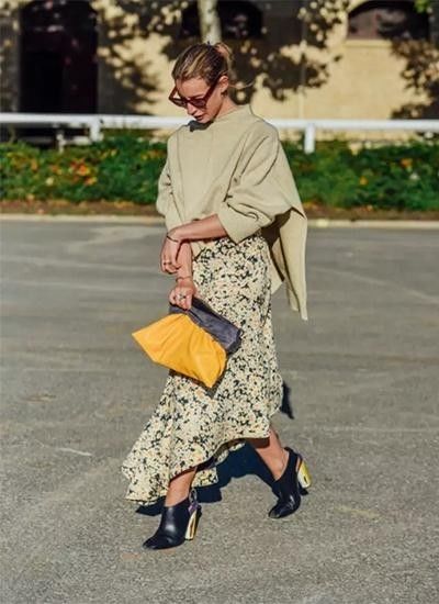 毛衣随性慵懒与印花长裙的飘逸