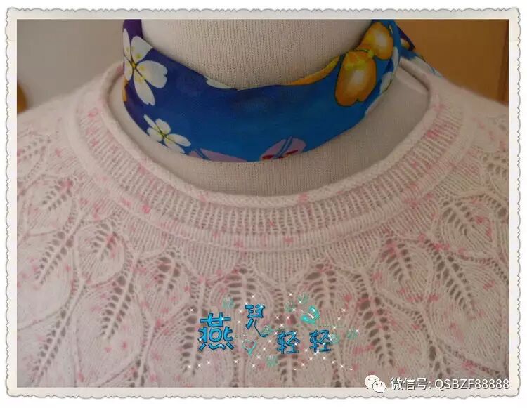 接下来开始领口的编织,把活头领口180针用棒针穿好,不加不减织四反一正四反,这9行完成后外翻开始缝合,为了防止领口缩小,用来缝合的那根棒针一定要用比原来的棒针粗两号。