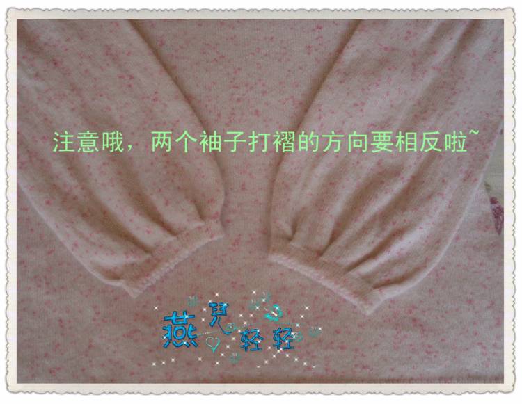 袖子挑后翘并且加上腋下针数共148针,每10行减2针减4次,剩140针后开始编织双螺纹30行,再往下织平针,每20行加2针加9次,灯笼袖的针数达到158针,最后均匀分8次打褶并掉78针,使袖口剩80针。这时袖口织10行后并一加一织鱼牙针,再织10行掩到里面缝合成双边。紧袖口的编织方法如下: