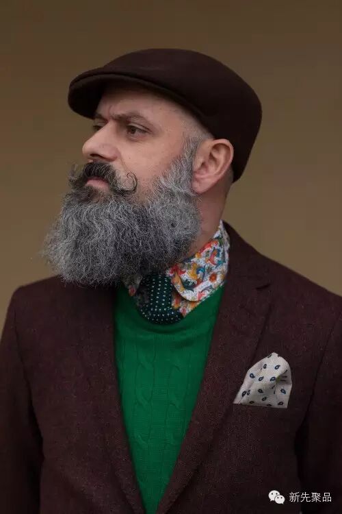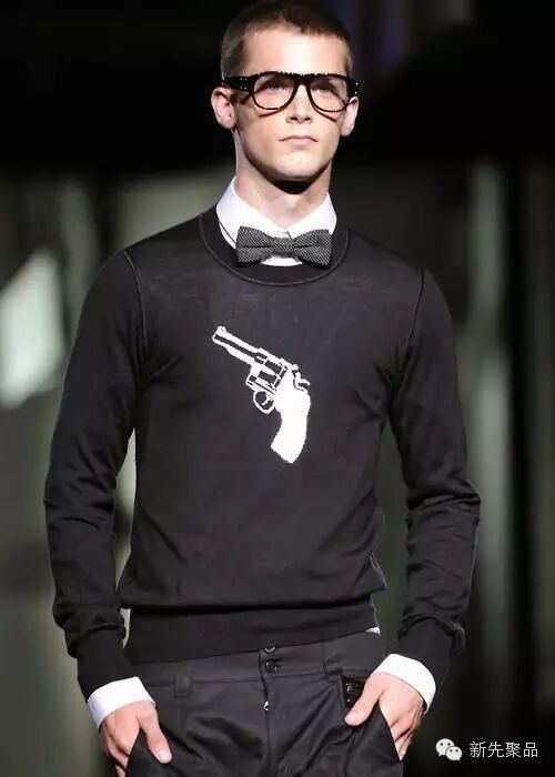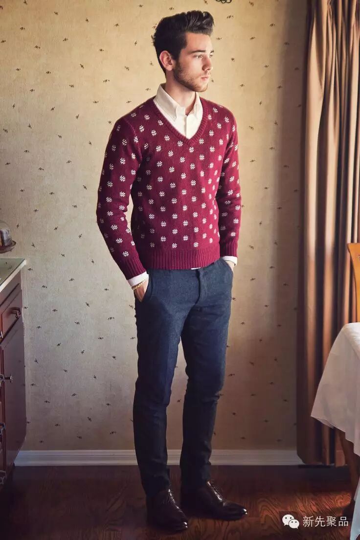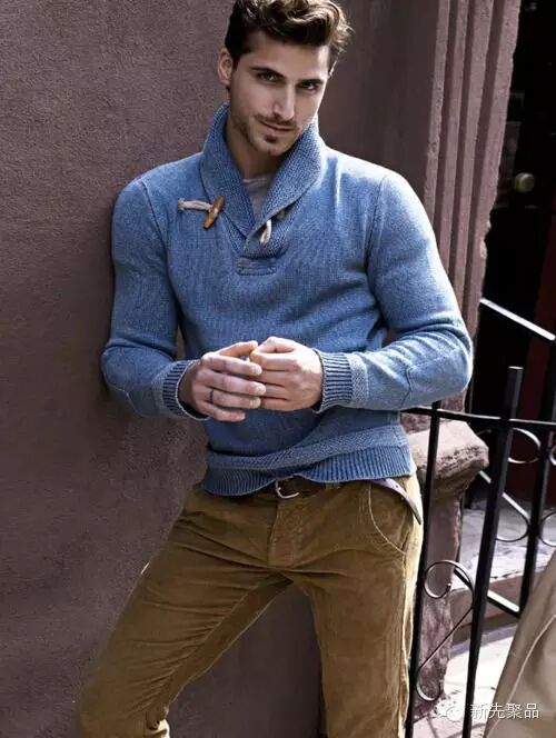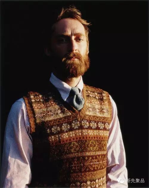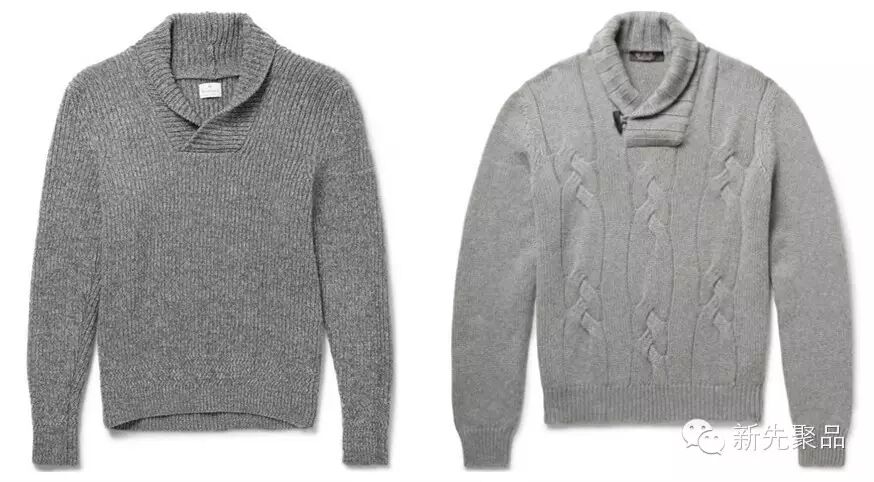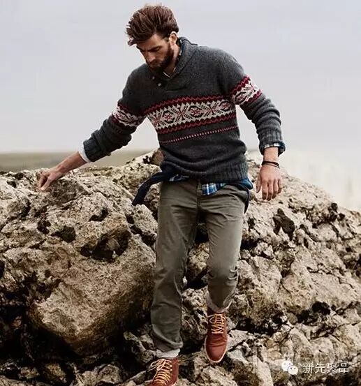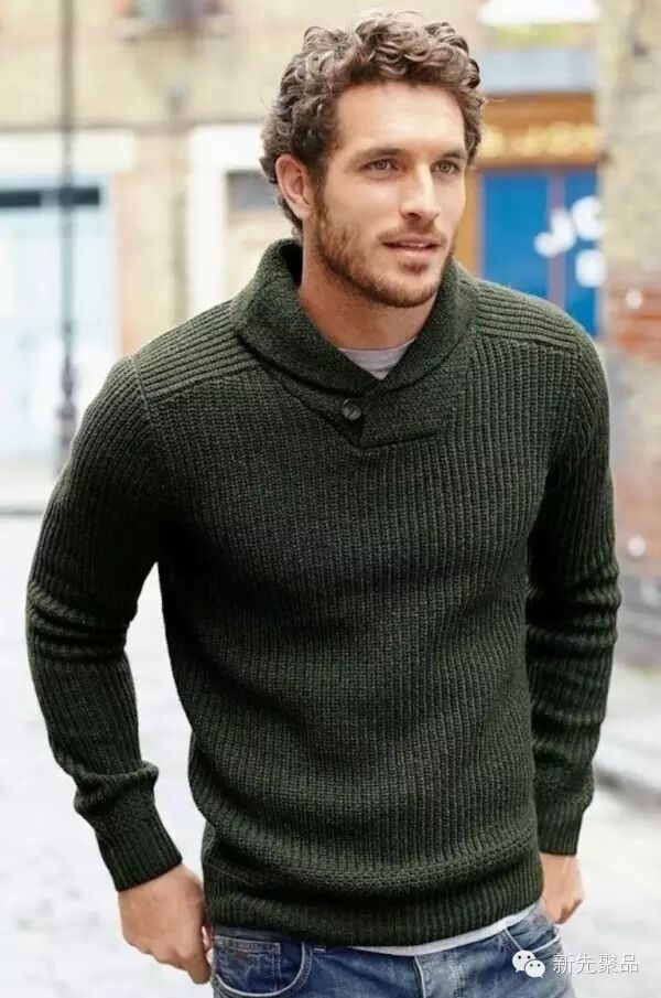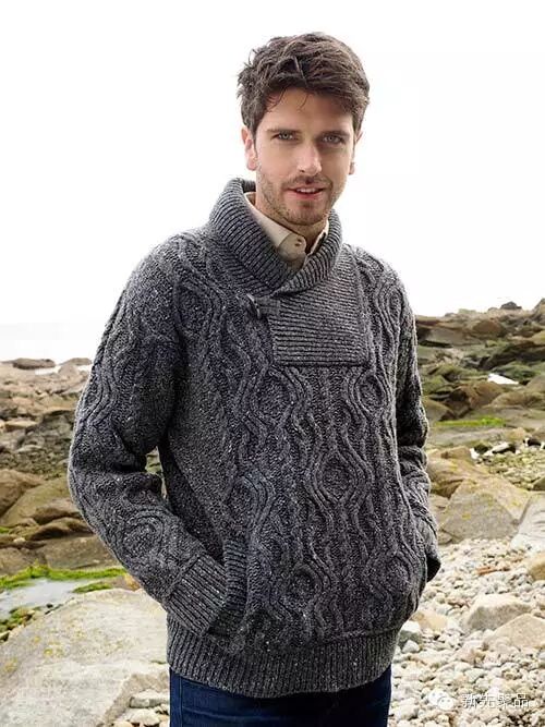 青果领的款式能够让男士看起来很浪漫。像上面讲的费尔岛纹花型毛衣,在青果领的衬托下会更加雅致。