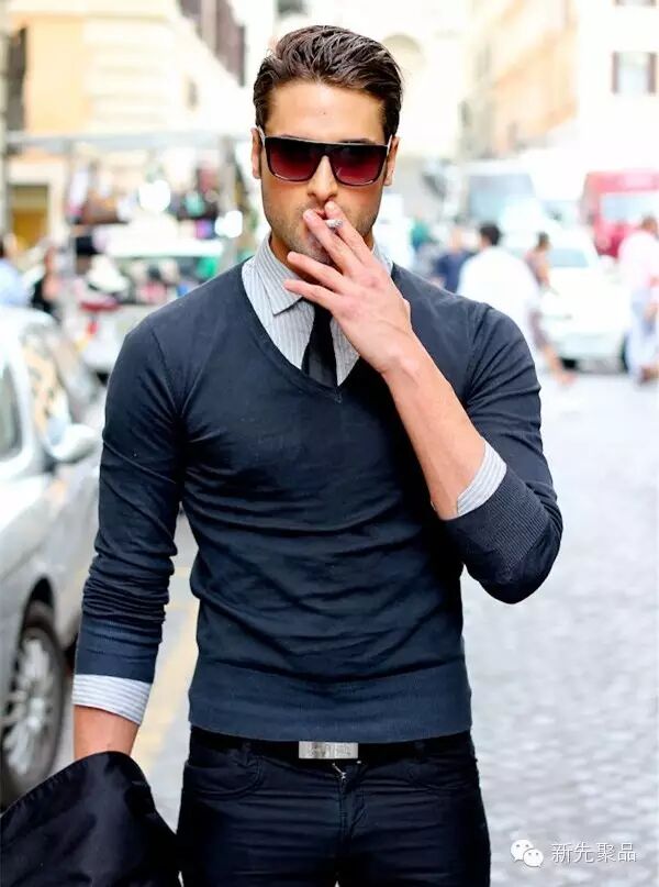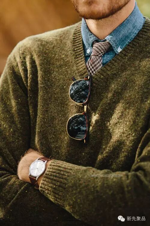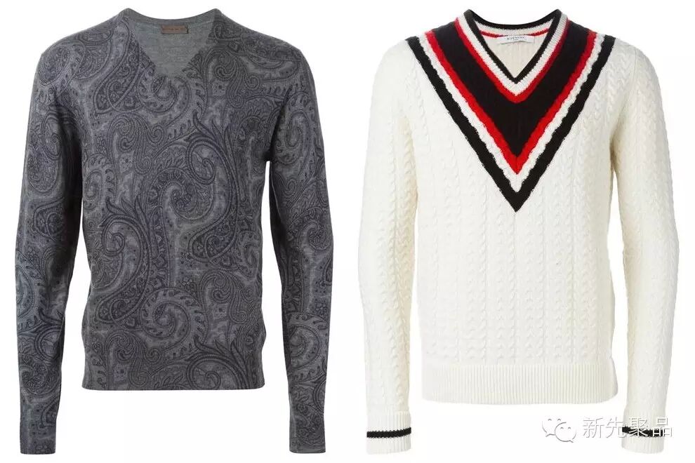 V领毛衣很显成熟,十分适合商务场合穿着。而且它还十分凸显胸肌,所以魁梧的男士穿这种款型的毛衣很性感。最不费脑的搭配便是领带+衬衫+V领毛衣+西装外套,最外面再披一件长款大衣。和基础款圆领毛衣不同的是,V领毛衣因领子更低所以也会让领带更舒展,整体效果也会比圆领毛衣更好。