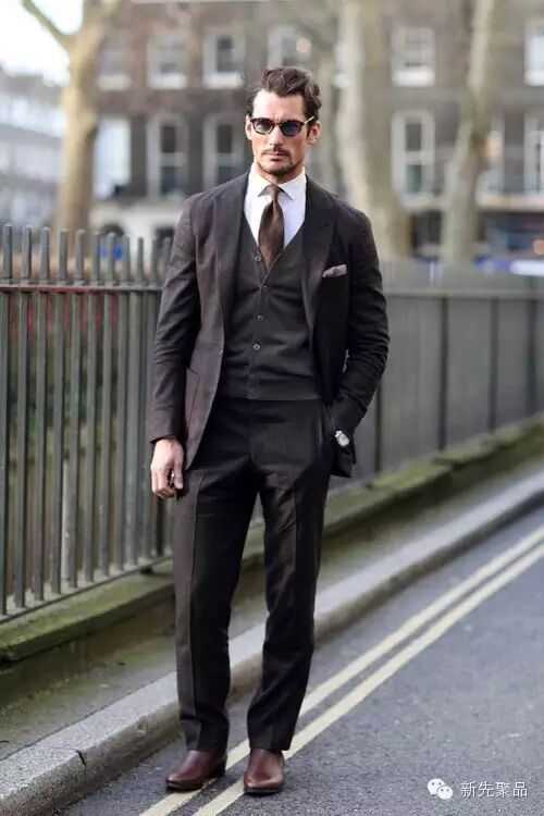 如果天气比较暖,比如在15—18度时则可以搭配修身马甲。若想穿出绅士感依旧要选择细腻的素色毛衣,整体色调提升的重任还是交给亮色马甲吧!
