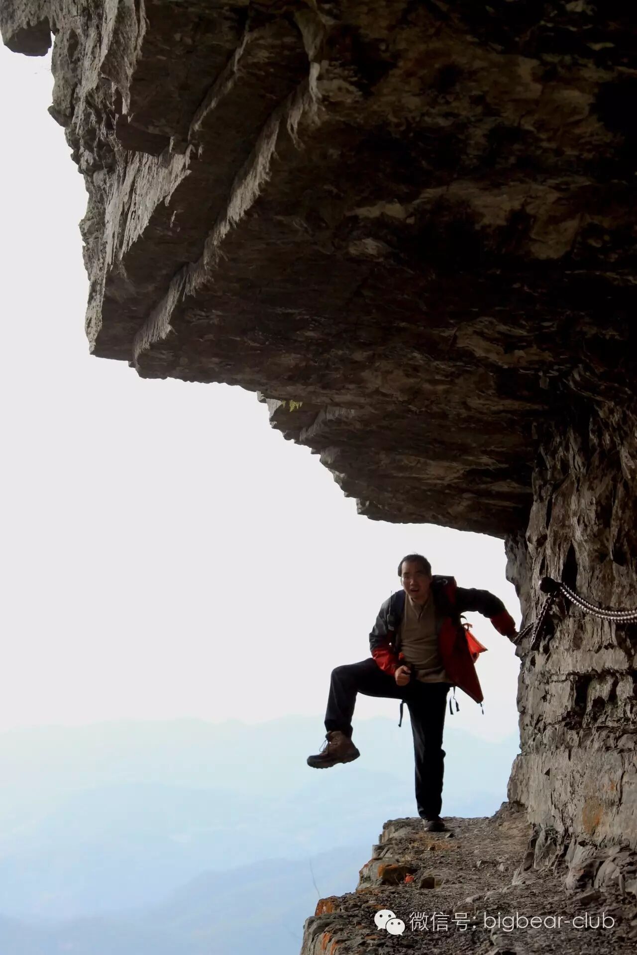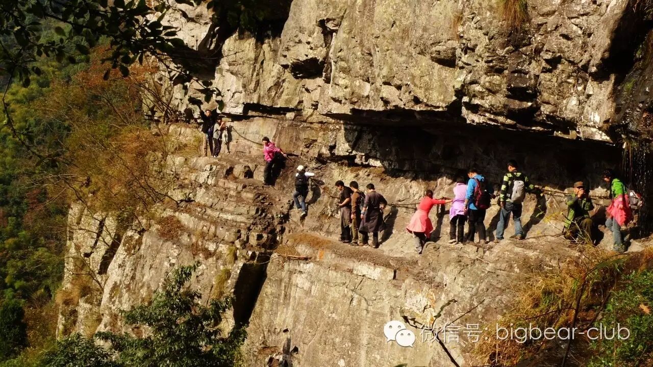 07.30开车前往划岩山徒步的起点。稍微休整下,我们开始上山,一路泉水叮咚,怪石峥嵘,沿山麓溪谷上攀,于松篁丛中穿行,别有一番野趣,简单吃点干粮后继续向上行走,开始到达划岩山最为险峻也是最壮观的飞鹰道。飞鹰道位于山屯峰上百米高的崖壁之中,天然造就的近米宽的崖腰石廊,呈平衡状态。于崖壁中穿行,俯视之,万丈深渊,令人不寒而栗,更令人叫绝的是上下鹰道都和瀑布相连,鹰道横空,飞瀑高悬,相映成趣,构成秀丽、奇险、壮观的画面。