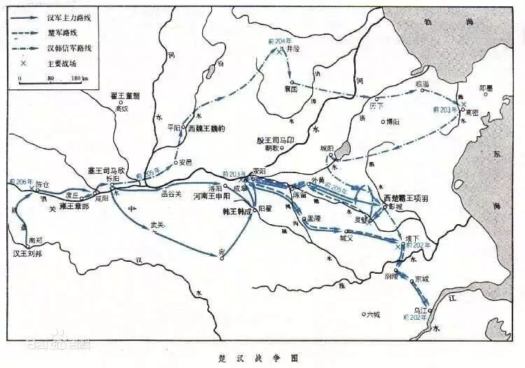 而后汉王刘邦从汉中出兵进攻项羽,项羽与其展开了历时四年的楚汉战争,期间虽然屡屡大破刘邦,但项羽始终无法有固定的后方补给,粮草殆尽,又猜疑亚父范增,最后反被刘邦所灭。公元前202年,项羽兵败垓下(今安徽灵璧县南),突围至乌江(今安徽和县乌江镇)边自刎而死。