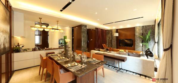 除了地下室,近9米面宽的横厅也是博足了眼球。阔绰,轩敞都不足以形容这种开阔的气质,非要形容,大概就是仪式感。大面宽带来的大户人家的庄重和气度,让客户交口称赞。餐客厨一体的通透,推窗见山的豁达,让每个客户生出了无限的想象。还有客户等不及讲解,步入了大庭院,在椅子上畅想起了未来的美好生活。