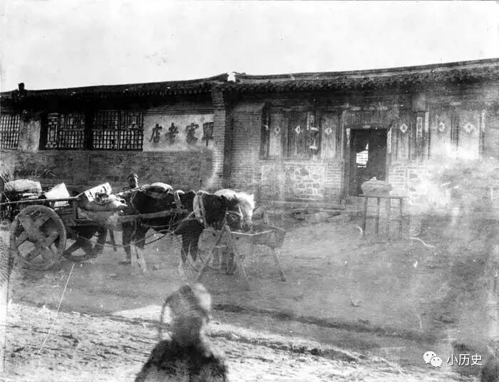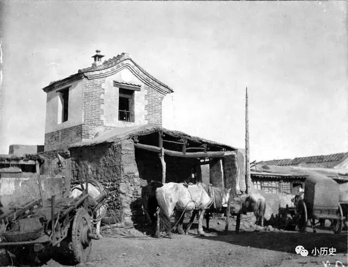 1906年12月31日,北京西南近郊,屋前的马匹和马车。