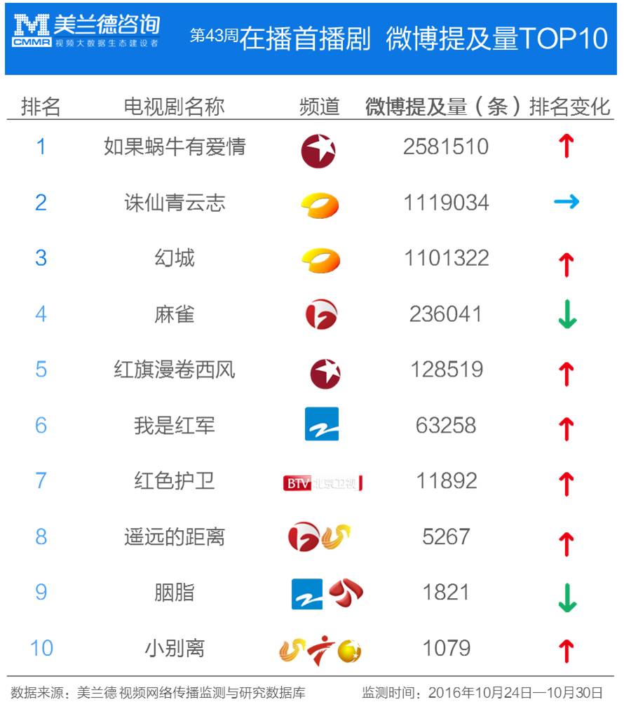 第43周,相较于如火如荼进行的综艺大战,首播剧的整体表现依然平平,不过随着《如果蜗牛有爱情》的开播,11月份将会有一波新剧上档,或将带来电视剧榜单的洗牌。