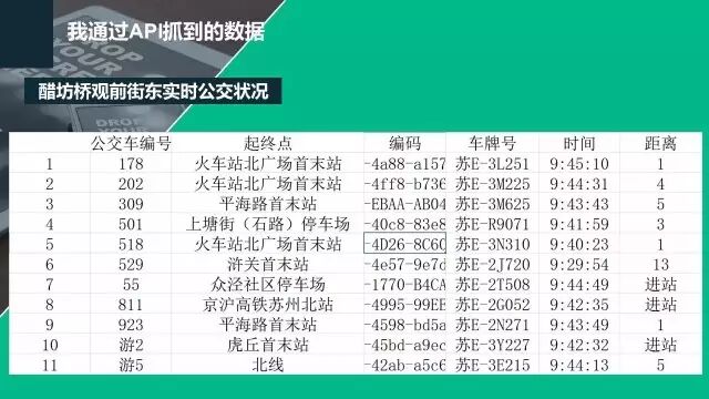 每条经过这个站点的公交线路、当前的状态都显示了出来。由此我们可以推测公交车还有几站到,到的车的车牌号。试想一下如果我们隔几分钟请求一次这个站点的数据,我们就可以了解到这个站点全天的动态数据,这样评价一个站点的公交运行状况就不用像以前一样需要调查员站在站点无聊地看着表数着车啦!