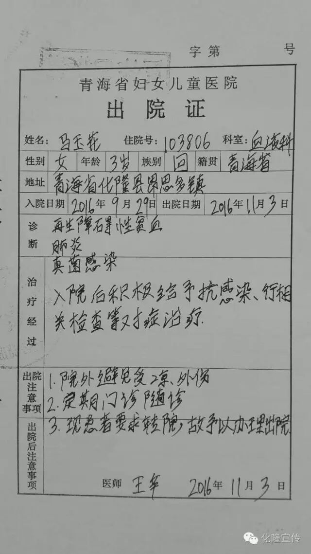 马玉花,女,回族,化隆县昂思多镇五道岭村儿童,2016年7月份,在江苏苏州大学附属儿童医院住院检查,诊断为严重的再生障贫血病。限于经济条件,该女孩随同父母返回家乡,现就医于青海省妇女儿童医院。前后住院治疗4次,先后花费近15万元,但成效甚微。院方透露,治疗这种疾病需要时间长、费用大。