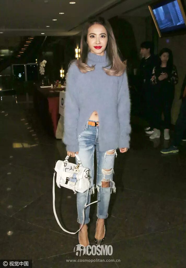 蔡依林最近真的有在穿搭方面用心,简单的圆领兔绒毛衣搭配破洞牛仔裤和高跟鞋,比例一百分。