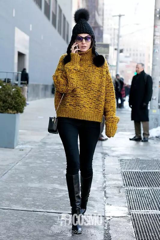 粗棒针毛衣其实不适合内搭,春秋季外穿搭配紧身裤或者短裙,有视觉上显瘦的效果。