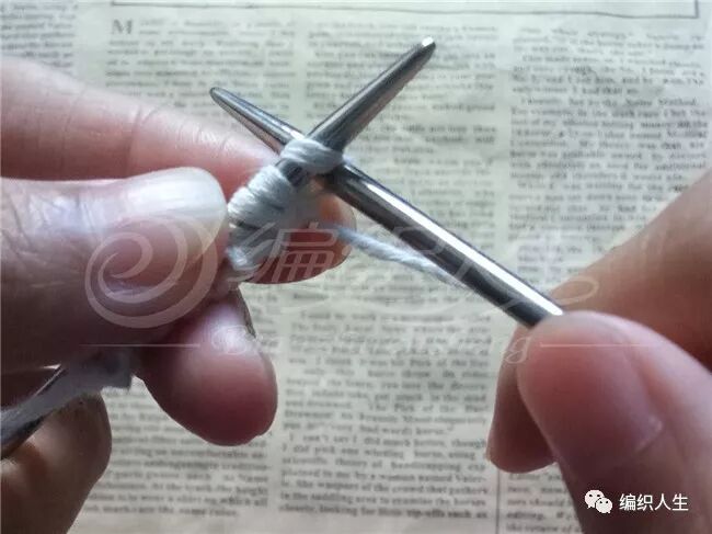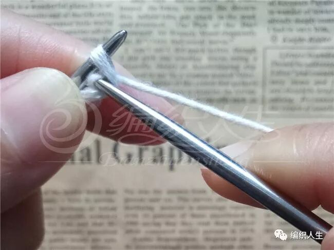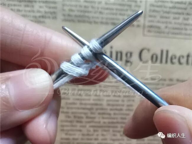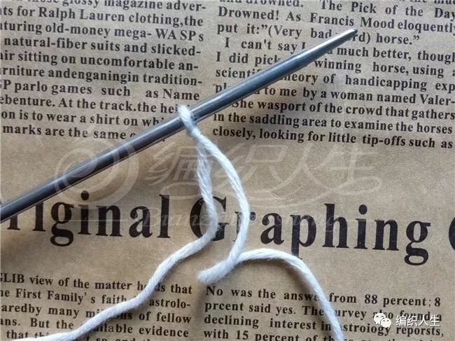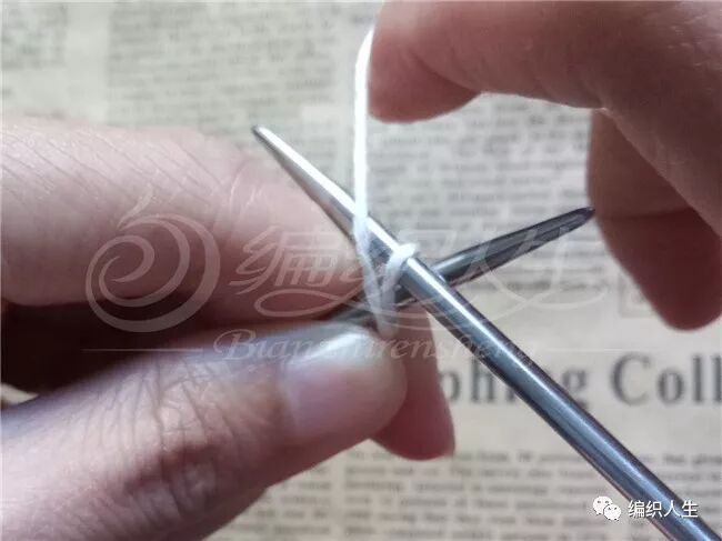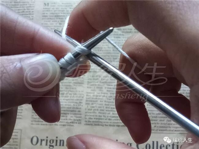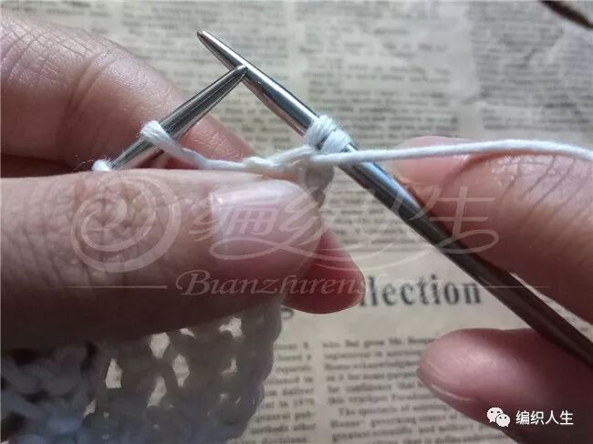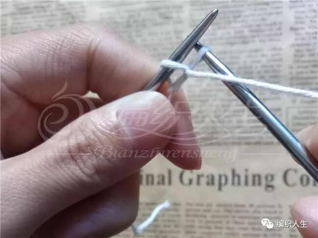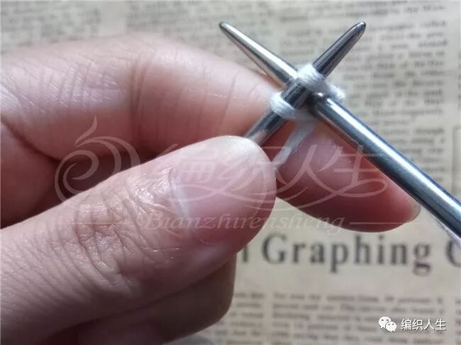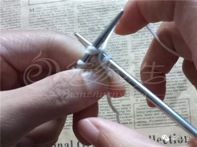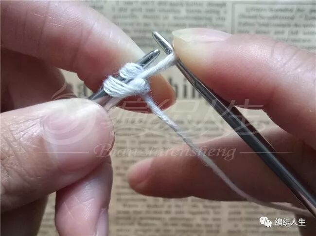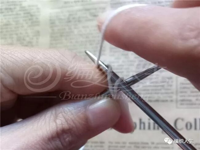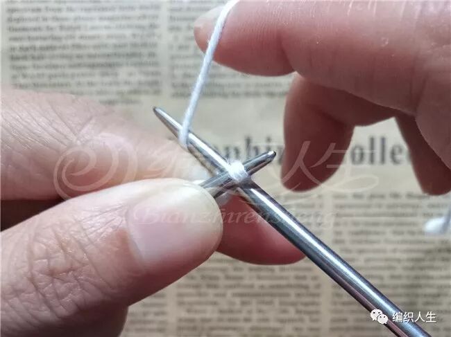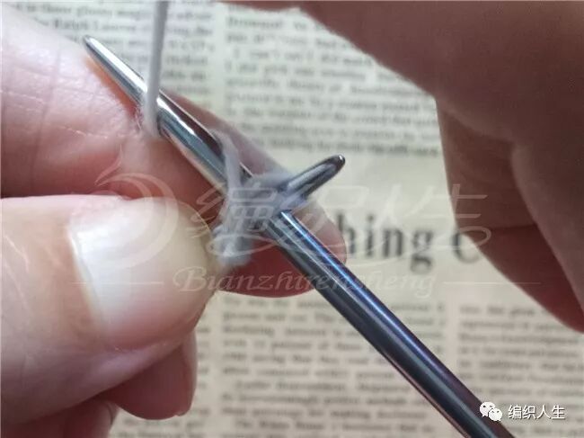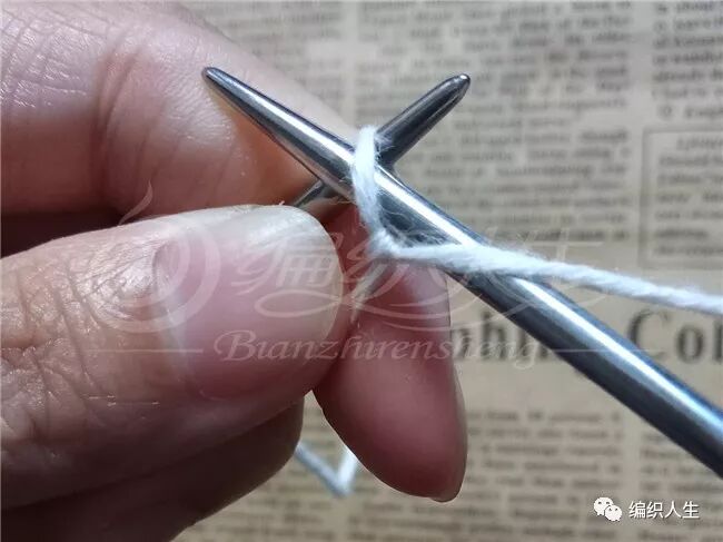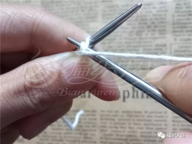 织线放在针的上面,将第一针的线圈直接从左针移至右针