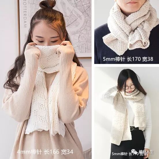 又会有亲问,围巾要织多宽?宽度也是要按自己的佩戴需要或者效果来决定喔,有人喜欢或需要窄的,有人则喜欢宽宽大大的,最方便的方法,找即有模特佩戴展示的,又有尺寸标注的资料,比如编织图解,比如某宝各类围巾商品,都可以参考喔,当然我们自己手织,还要考虑进用线的粗细,下面附一份用粗针粗线织的围巾尺寸供参考)