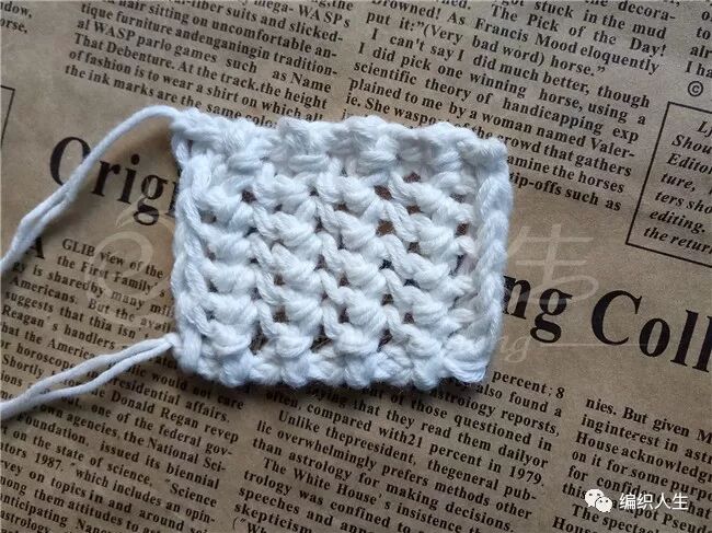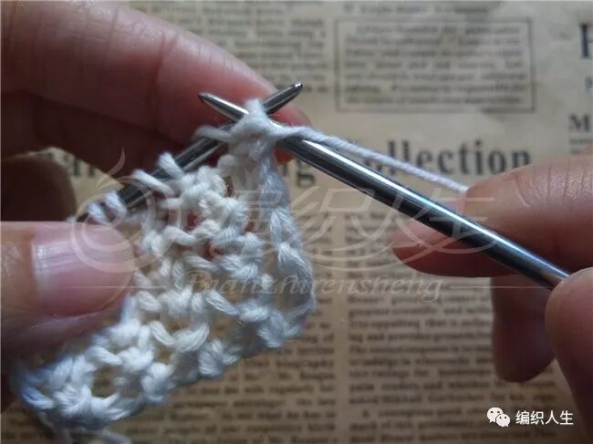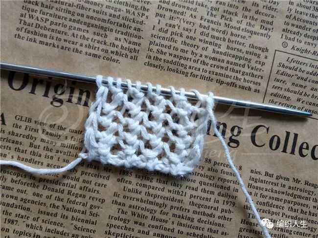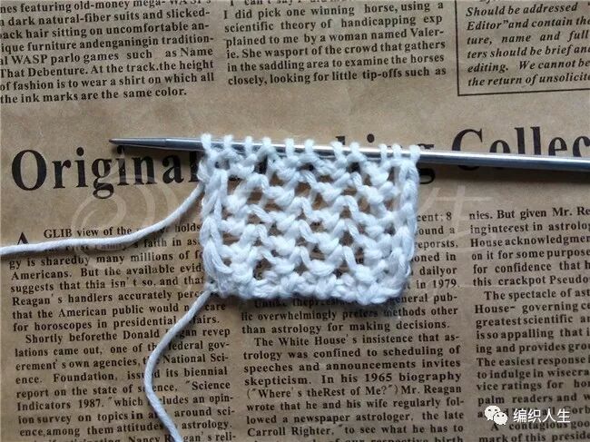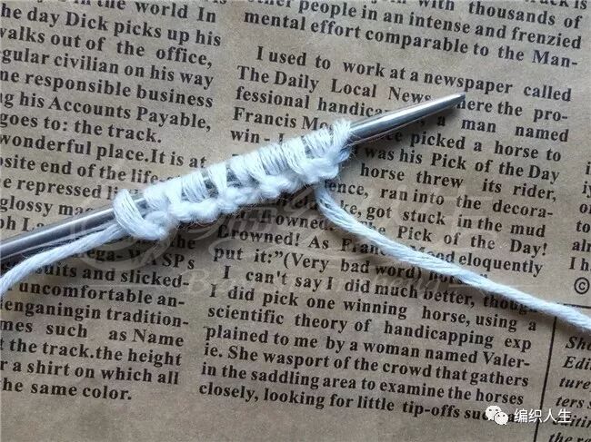 将织物翻面,之前的右针变左针,注意线头的位置,翻面后线头在右侧,开始织第2行,情人结花样也就是这一行的重复再重复,需要注意每行刚开始织线的位置。