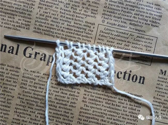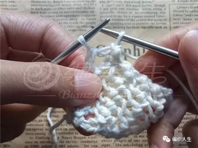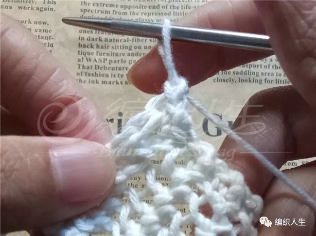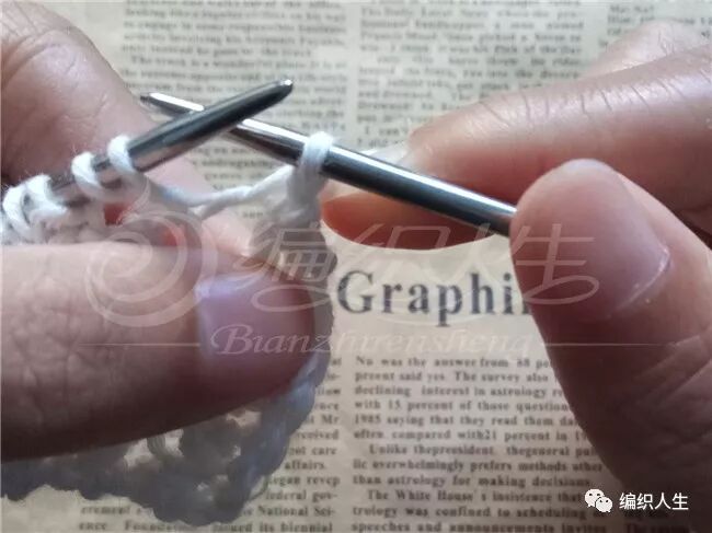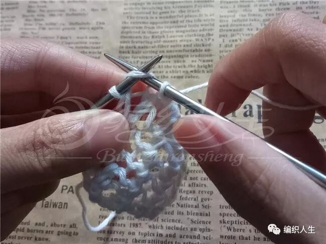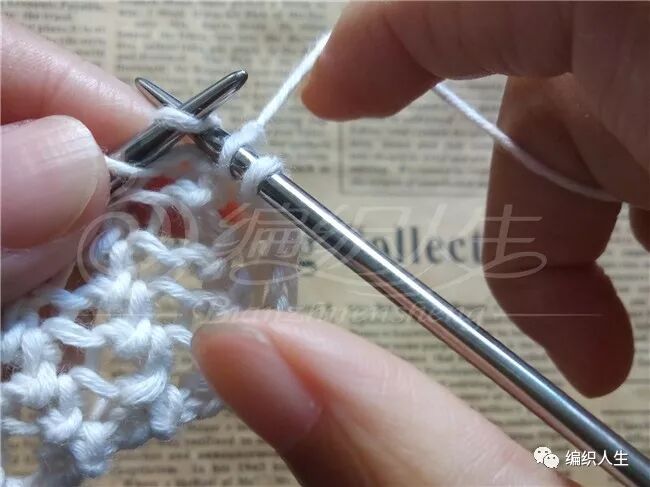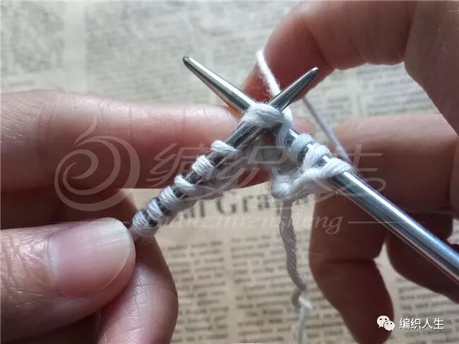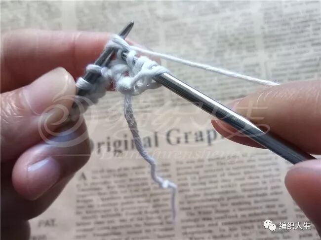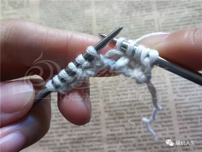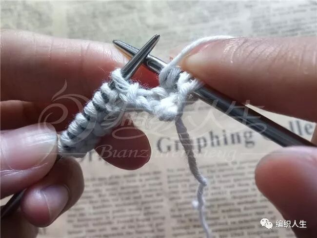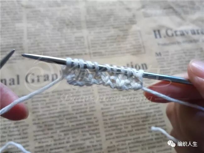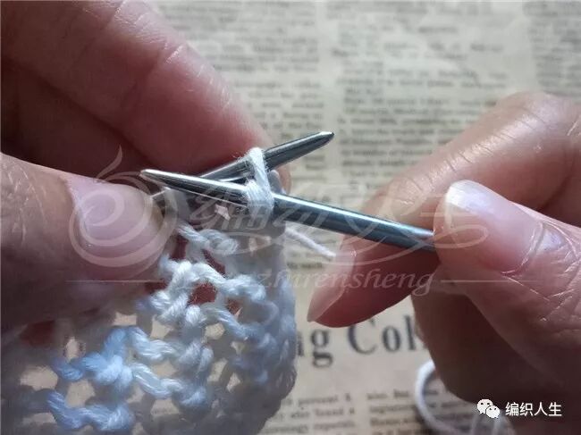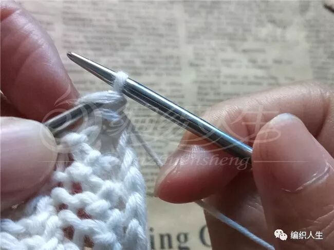 第2行,第2针--加针,第3针--下针2针并1针。(不需要调整织线的位置,直接织下针2针并1针)