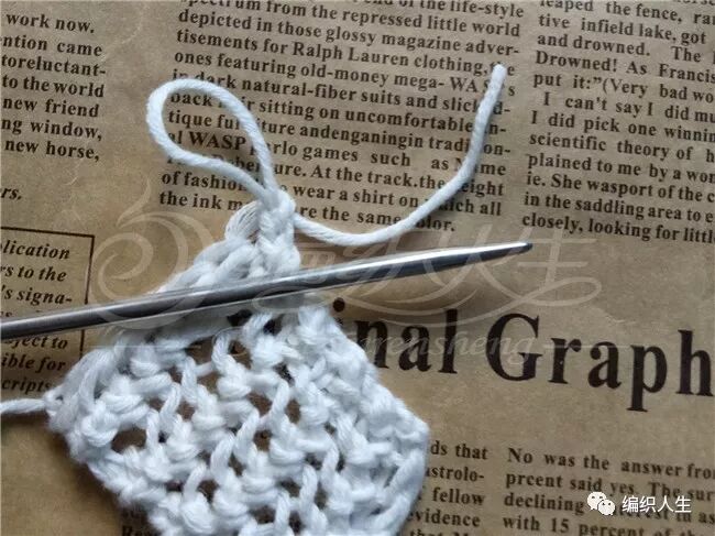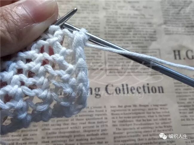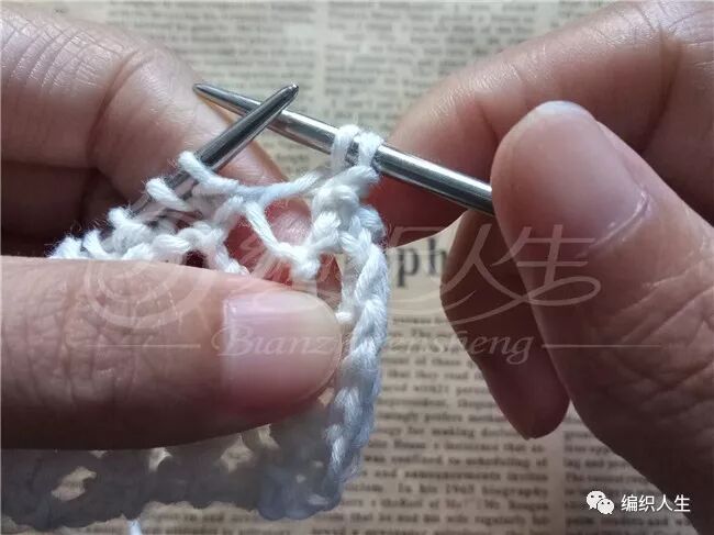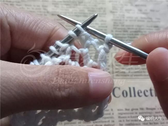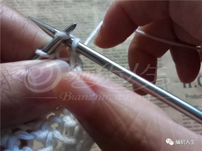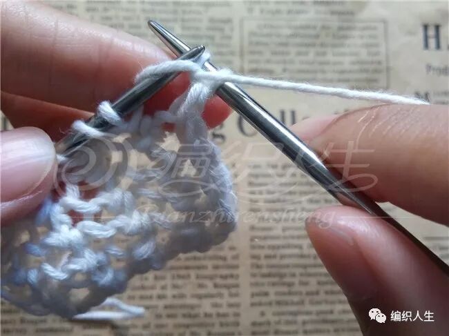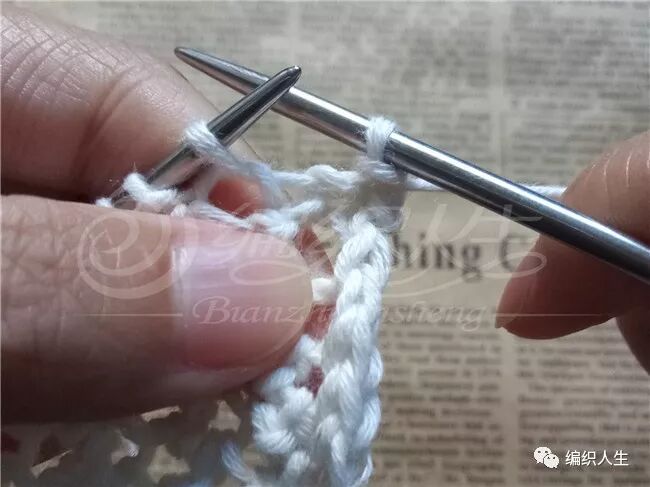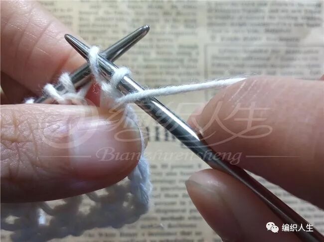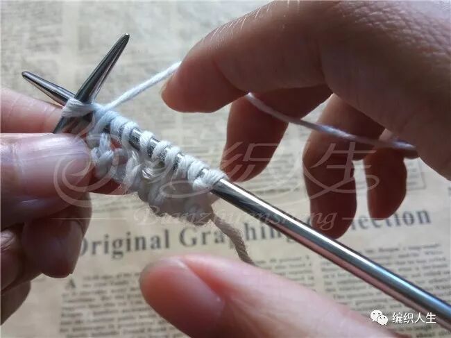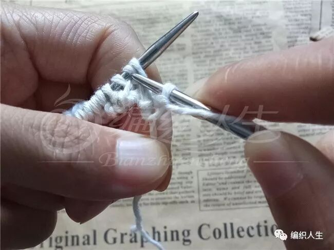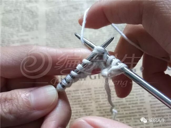 起针第4针--上针(从第2针、3针的针目中间入针织上针,织好后的线圈套到左针上)