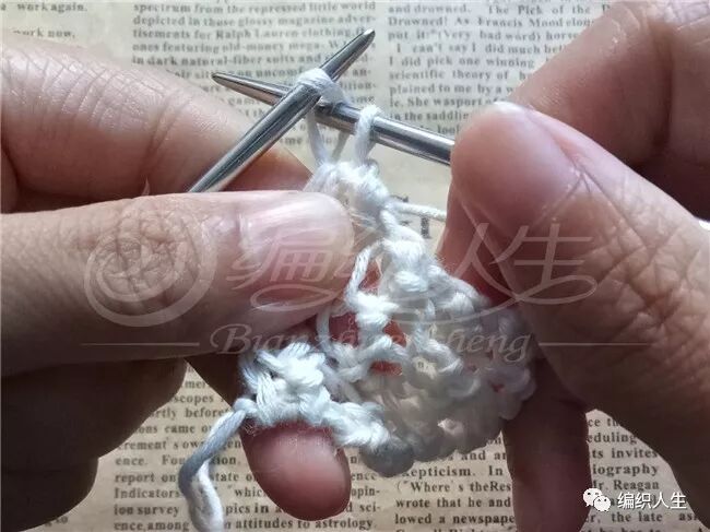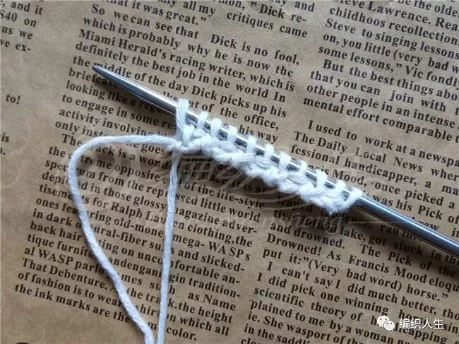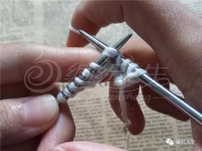 结束,单数针织下针(即情人结”结“的部分织下针),双数针织上针(即情人结”人“的部分织上针)。第1针直接从左针移至右针,不织。