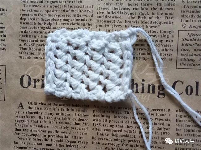 如此,情人结花样就完成了,后面就是重复第2行的织法,一直到需要的长度。第2行刚开始线的位置,及挑下线圈,都需要注意,否则边缘可能不能不整齐或不能形成辫子样的效果。下面是织过一部分后,两面的效果。