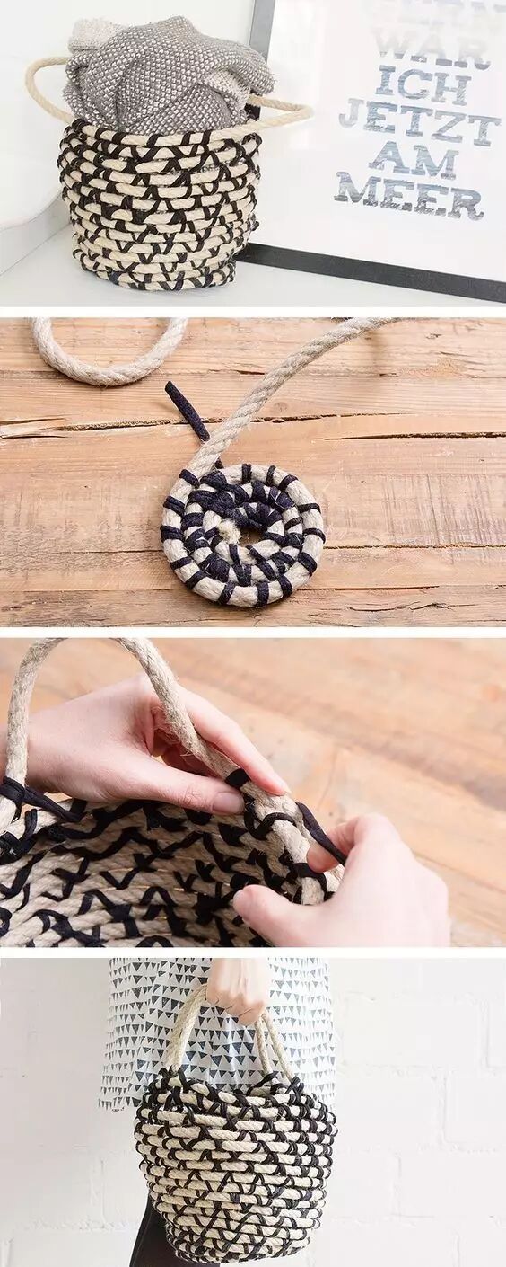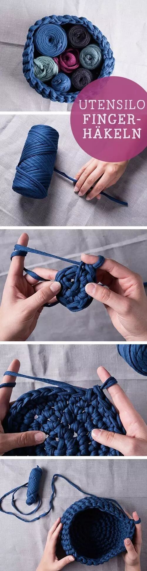 钩个收纳篮,用手代替钩针把布条钩起来就可以啦!