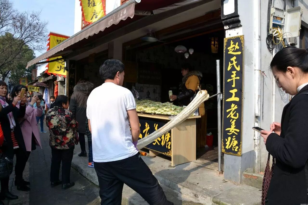 路旁有表演手工甩糖的,引得众人驻足围观。