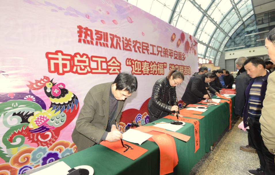 2017年1月18日上午,张家港市总工会和书法家协会在市长途车站候车大厅联合举办了“迎春纳福送春联”欢迎农民工亲兄弟平安返乡专场活动。来自中国书法家协会、江苏省书法家协会、苏州市书法家协会、张家港市书法家协会等15名书法家参加了活动。公司书画俱乐部推选的陶国平、叶曼郦作为特邀嘉宾也参加了本次活动。