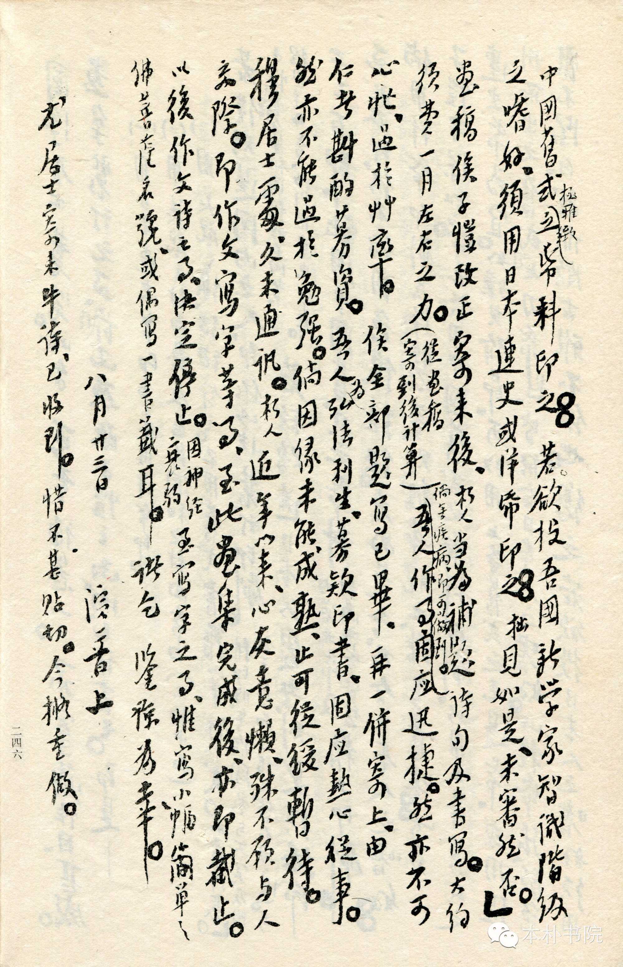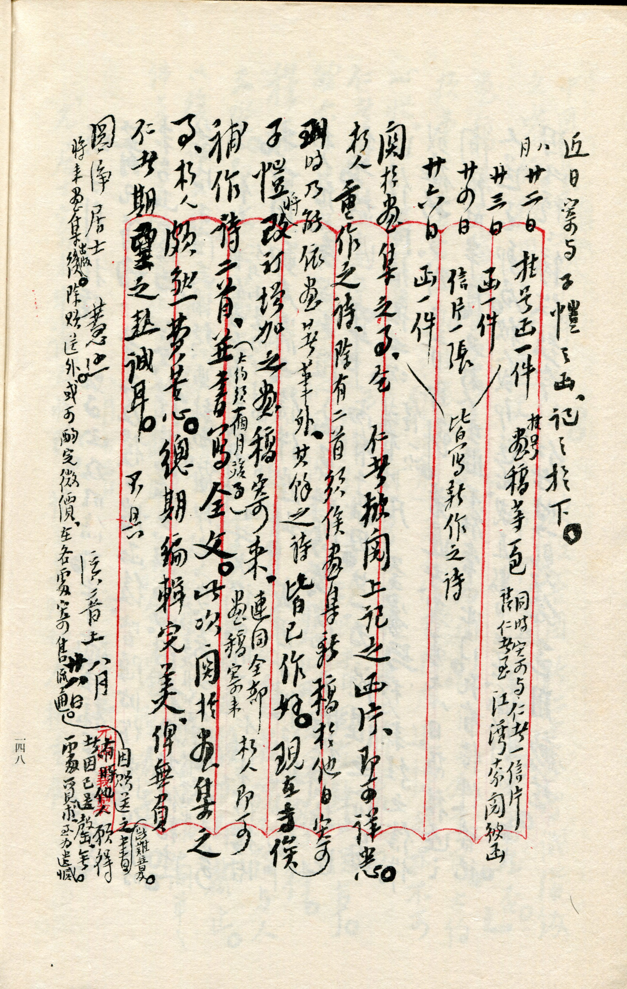 就此通信札内容而言,全篇围绕《护生画集》的编辑娓娓道来。如“题名为《护生画集》,甚善。但其下宜增三小字,即‘附文字’三字。”“此封面,请子恺画好,由朽人题此书名。至若题辞,乞湛翁为之,诗文皆可。”“将来《护生痛言》排板之时,其字之大小,排列之格式,皆乞与子恺商酌。初校之时,亦令彼一阅其格式合否。”“此书虽流通甚广,雅俗共赏。但实偏重于学者一流之机。因子恺之画,朽人与湛翁之字,皆非俗人所能赏识。故应于全体美观上,十分注意也。装订以洋装为宜。如《到光明之路》之式,最善。”大师对《护生画集》,从题材内容到版式编排都煞费苦心,题字题诗再三斟酌,就连来往的书信也写得细致入微,唯恐不能尽善尽美。弘一法师在绘画、戏剧、音乐、教学上融汇中西,开风气之先。但“先生似乎嫌艺术的力道薄弱,过不来他的精神生活的瘾”(丰子恺语)而绝尘遁世,出家后他持律谨严,苦行求法,成为一代高僧。丰子恺说:“他是最像人的人。”朱光潜也评价道:“以出世的精神做入世的事业。”他认真的处世态度、慈悲博爱之心和境界高远的艺术都是一座座巅峰,让后人可望而不可即。