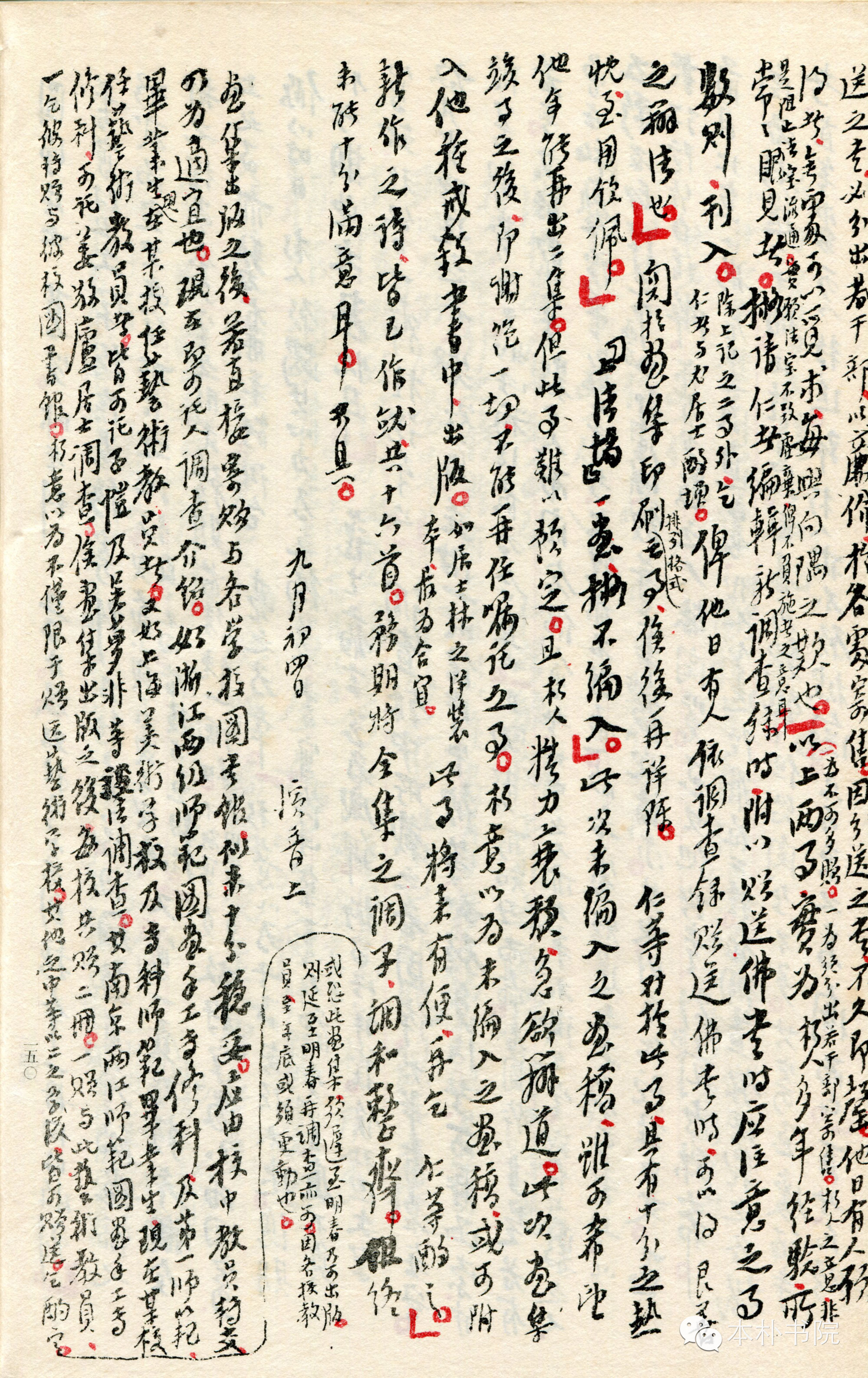 此信札是弘一大师1927年前后在温州庆福寺写给李圆净的,长34.5厘米,高12厘米。整篇行书挥就,神敛锋藏,一笔不苟,平和静穆,风骨独具。状若蝇头,朱砂标注点缀其中,越发古朴淡雅。虽然与后期返璞归真之风相比还未完全摒弃人间烟火之气,但“弘一体”已初见端倪。