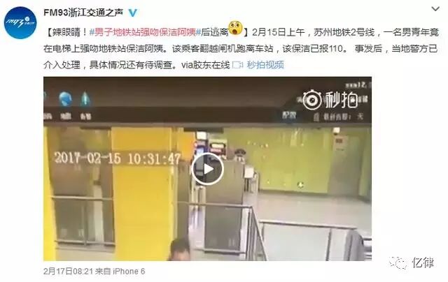 2月17日新浪微博大V们纷纷转载【辣眼睛!#男子地铁站强吻保洁阿姨#后逃离】事件,事情发生在2月15日上午10时31分42秒到52秒之间,苏州地铁2号线,一名身着墨蓝色上衣男青年跟随女保洁员身后乘坐扶梯,之后称保洁阿姨不备,强吻了她!!!