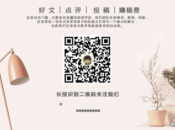 这里没有门槛,只要是有质量的原创作品,我们负责修改、配图、排版,这里将给一切有文学梦的孩子和各路文艺青年一个展示的舞台,也是我们交流语文教学和家庭教育的自由地。