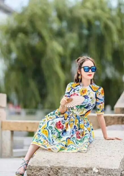 江一燕的这款宫廷式繁复的印花裙显然是众女神当中最难Hold住的一款裙子了,然而她用彩色的墨镜和民族风的耳环搭配这大印花的裙子别提有多时尚了!