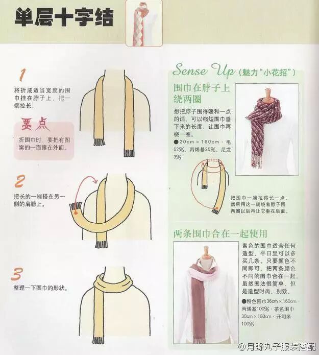 8字系法很简单,只是系个简单的平结,因为以8字形套在脖子上,所以看起来觉得造型比较复杂,系好的披肩会在胸前留下层次丰富的披肩褶,能给人留下深刻印象。
